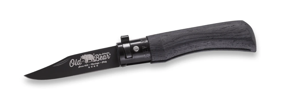 The Old Bear knife is made without a no-return spring which means the blade locking system features a solid safety ring that fixes the handle in open and closed position.