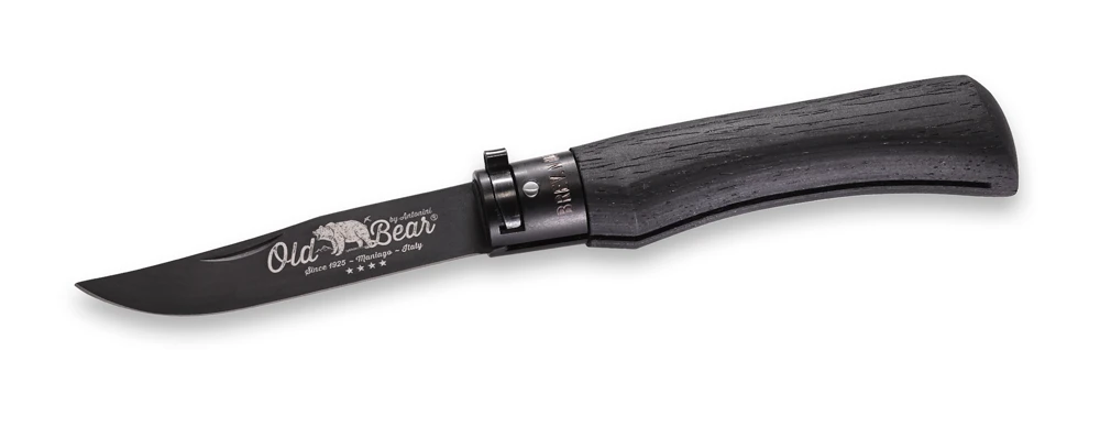 This Old Bear knife handle comes in laminated wood, while its blade is in black PTFE coated stainless steel with a aluminium locking safety-ring with black anodization and is stone sharpened by skilled and qualified craftsman.