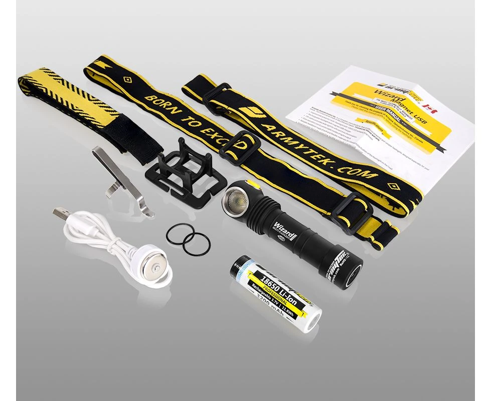The Armytek Wizard Pro V3 head torch has a max output of 1800 lumens (the warm white version has a max of 1674 lumens) from the Cree XHP50 LED and is powered by an 18650 Li-ion battery.