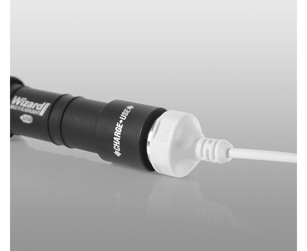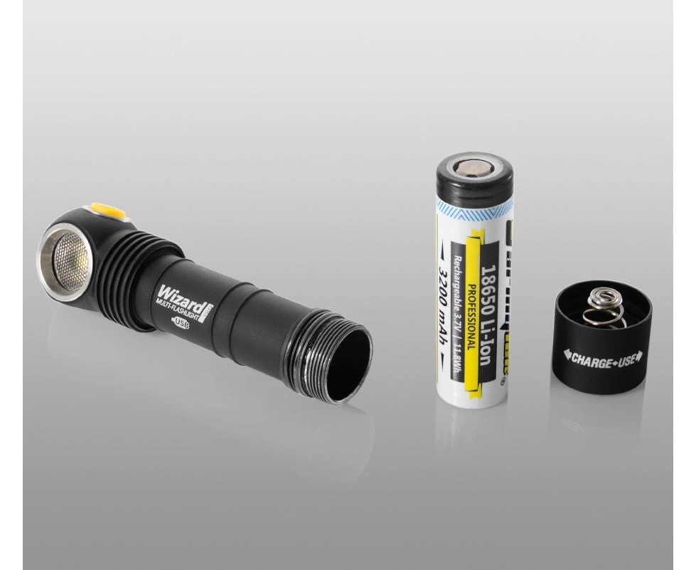 The flashlight comes with a 3200mAh 18650 flat top Li-ion battery and a magnetic charging cable which can easily be attached to the base of the Wizard Pro V3, allowing for easy and convenient charging.