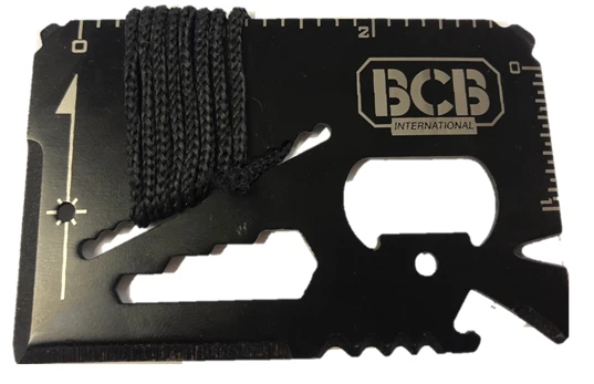 The BCB Pocket Survival Tool is a credit card size stainless steel multi-tool packed in a leather pouch with useful features for an every day carry gadget.