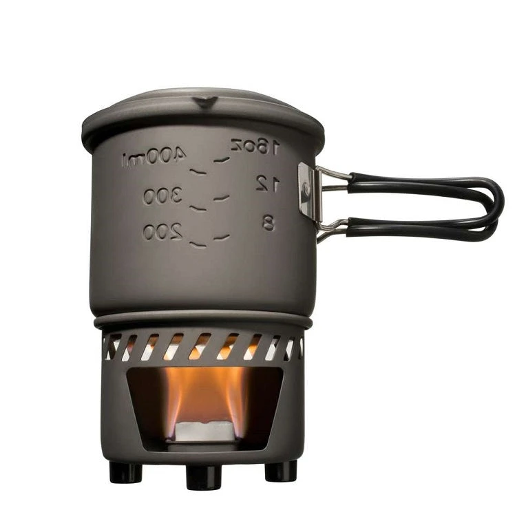 High perfromance cooking with solid fuel tablets, comes with a lid and a wind resistant stand which all go into the pot to save space.