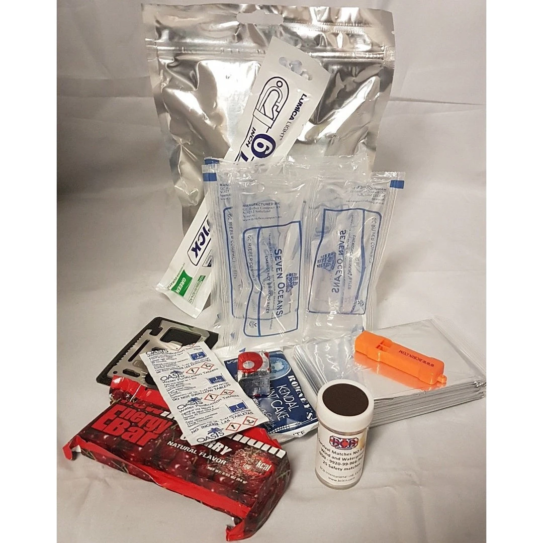 Contains a tough pocket survival tool that features many uses including a blade, can opener and bottle opener, an emergency blanket for shelter and signalling, waterproof matches to light your camp fire in any weather, plus emergency food rations and some emergency water to get you going until your in a position to use your purification tablets.