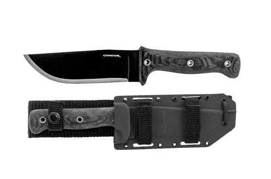 The Condor Crotalus Knife is a quality bushcraft, all purpose knife built for hard work under all conditions. It has a 1075 high carbon blade with a full exposed tang that has an epoxy black powder coating. The handle is made of Micarta and comes supplied with a Kydex sheath which is totally Molle compatible.