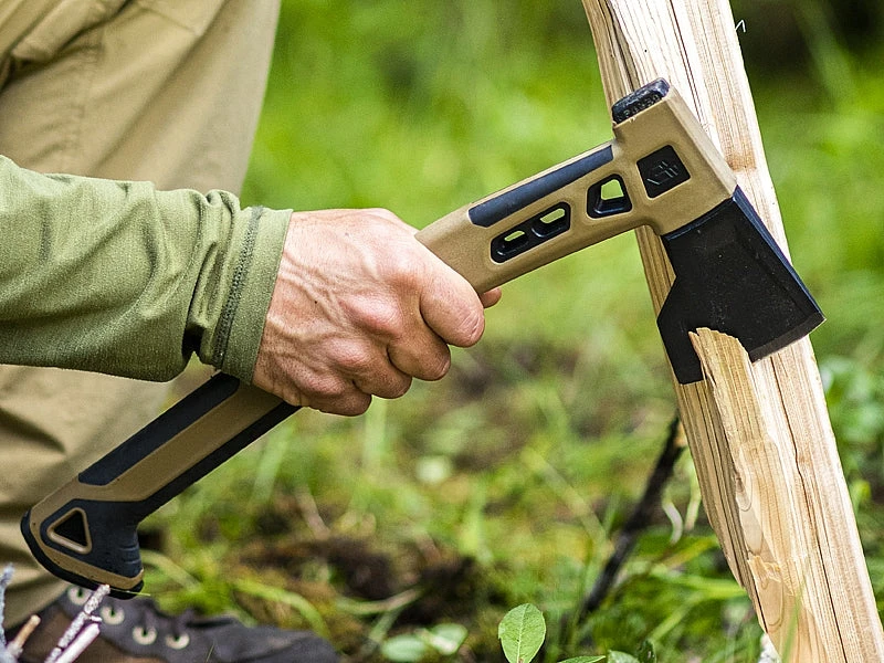 The Gerber Bushcraft Hatchet has a single-piece axe head with overstrike guard that ensures durability, while the rubber overmold grip at the bottom of the axe head provides additional choke-up cutting utility. A hammerhead on the back is not the end of the features – the waterproof Gear Storage Stick nests in the handle, hosting 5 inches of paracord and one storage compartment for a mini lighter, firestarter, or dry tinder.
