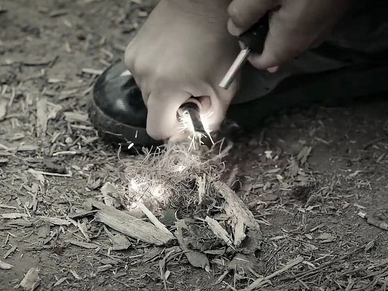 A small rugged fire starter with a ferrocerium rod and metal striker that gives thousands of sparks for years of bushcraft and camping fires.