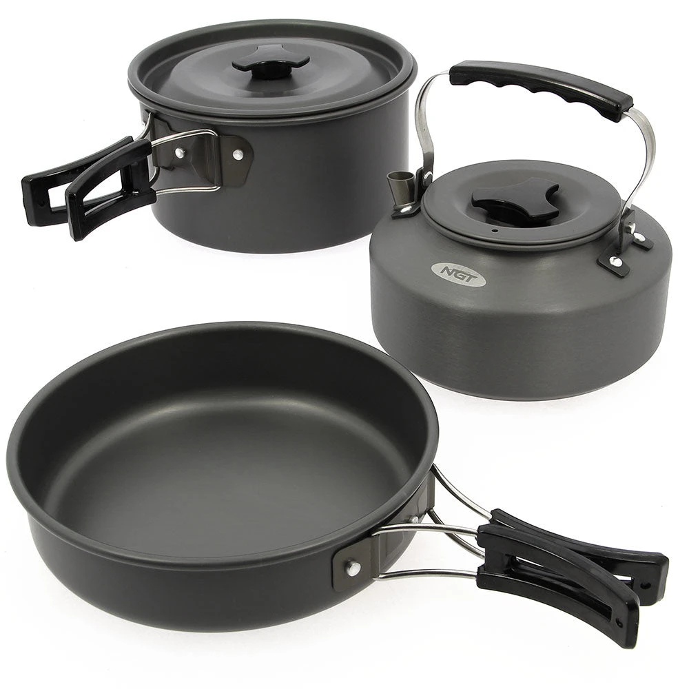 The NGT 3 Piece Cook Set is ideal for the outdoor enthusiast. All items are made from a durable, lightweight anodised aluminum. All the items can be stacked inside each other to keep them compact.