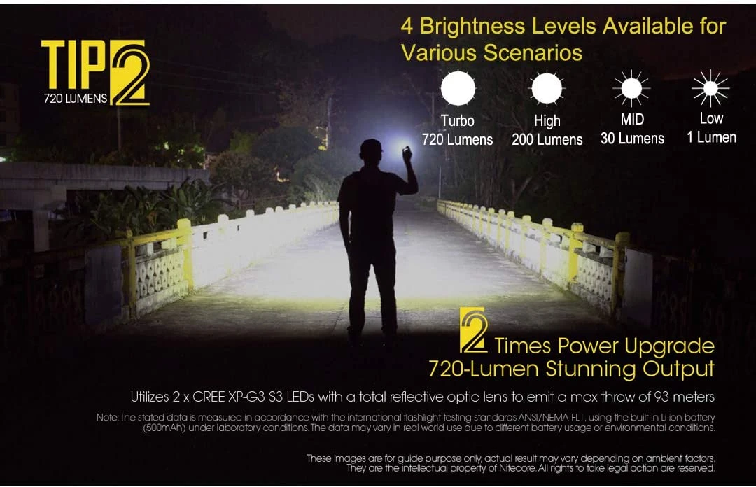 The TIP 2 features a demo mode which automatically turns off after 30 seconds and a daily mode providing long-time illumination. The light offers four brightness levels ranging from 1 to 720 lumens. The keyring torch has a CNC machined, aluminium alloy design which makes the torch lightweight and offers excellent heat dissipation.