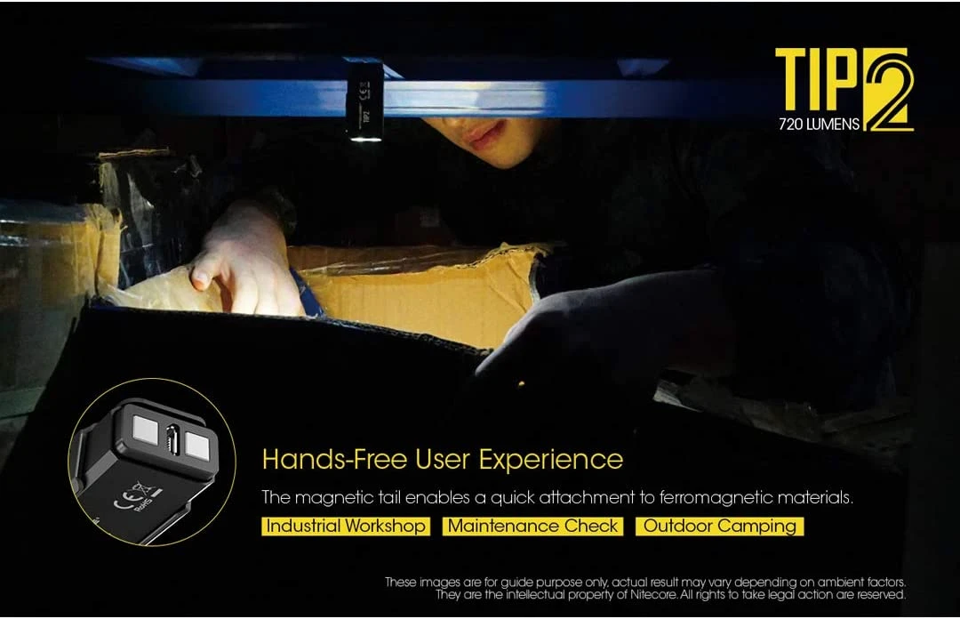 The TIP 2 torch has a magnetic tail cap which can be separated from the body of the light for quick detachment. Features two neodymium magnets, the TIP 2 can withstand up to 2.5kg of weight. Additionally, the magnetic tail cap can be used to attach the flaslight to ferromegnetic materials such as when tinkering on cars, camping or using in an industrial space.