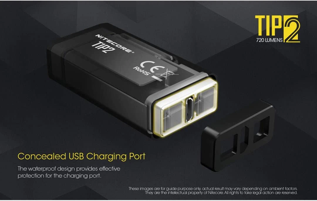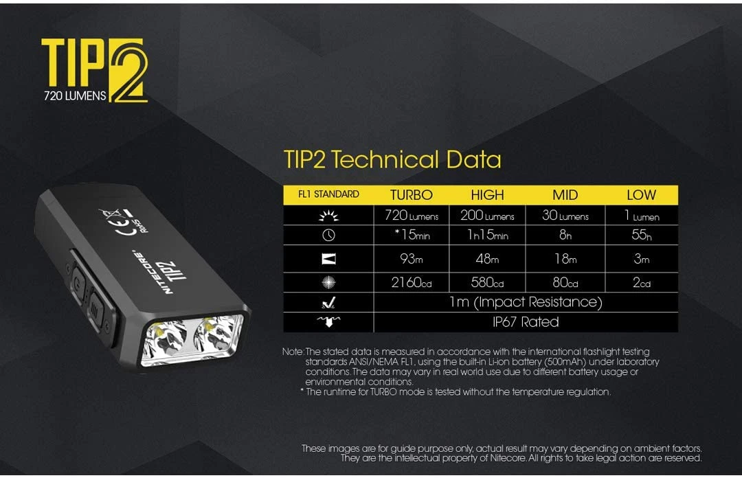 The Nitecore TIP 2 re-chargeable keyring torch has a maximum output of 720 lumens from the 2 x Cree XP-G3 S3 LED and is powered by a built-in Li-ion battery.