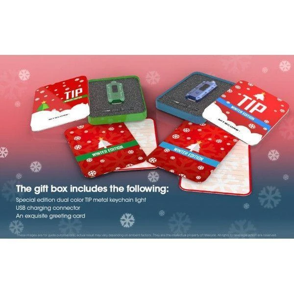 The Nitecore TIP XP-G2 Keyring Torch Gift Set is an ideal Winter keyring light and the perfect gift, the TIP keyring torch gift set comes in a winter edition presentation tin with a USB charging connector and a greeting card for you to personalise, a limited edition for winter 2016 with only one batch being produced, so once they are gone that’s it!