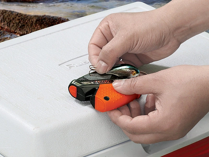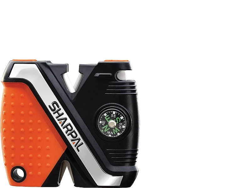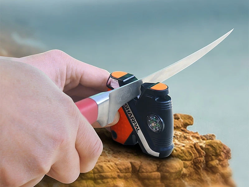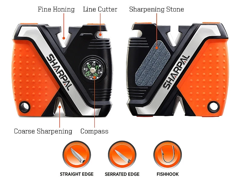 The Sharpal Fishingpal knife and hook sharpener has a multi-groove sharpening stone for fishhooks and pointed tools. It also has Tungsten carbide blades for quick edge setting and ceramic rods for fine honing. The Sharpal Fishingpal comes with a built-in rust proof line cutter and an integrated compass for directional travel.