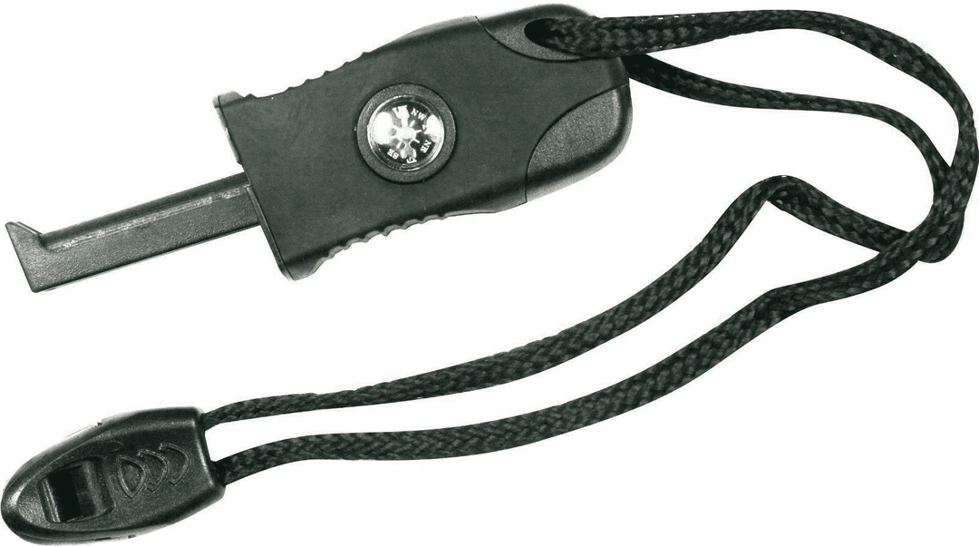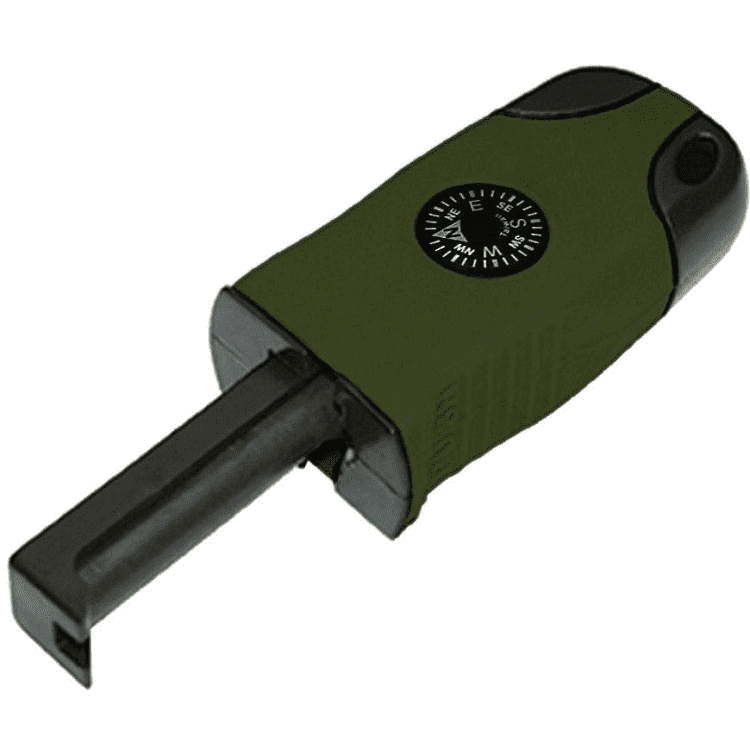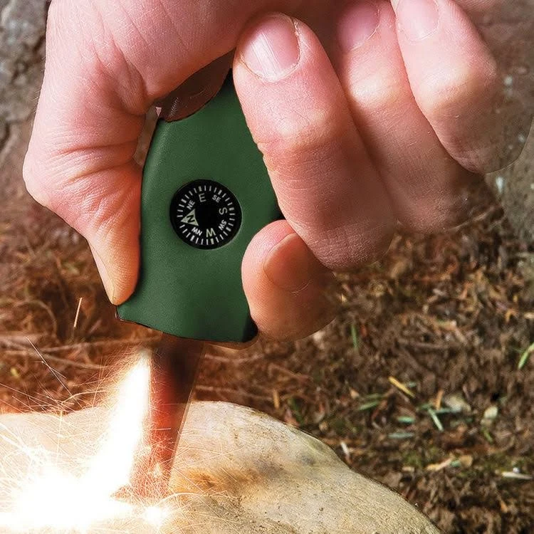 Simply press “push” to release the spring-loaded steel-of-fire flint and apply a constant downward pressure to light your tinder. Also features integral liquid filled mini compass and olive green lanyard with mini survival whistle.
